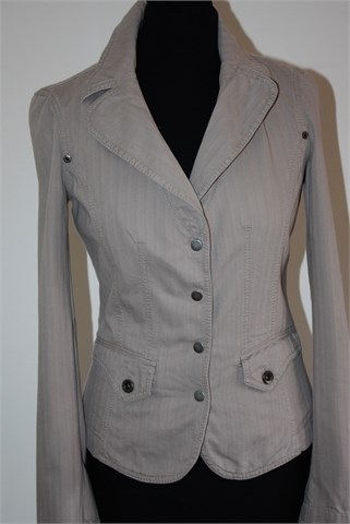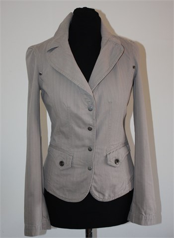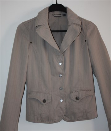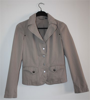 Mexx pamučna jakna, sivo-bež boje. Prednje kopčanje sa drukerima, bočni džepovi (sa preklopom i gumbom). Strukirana, deblji i nerastezljiv pamuk.