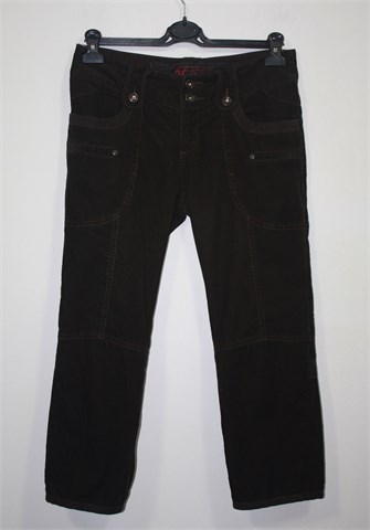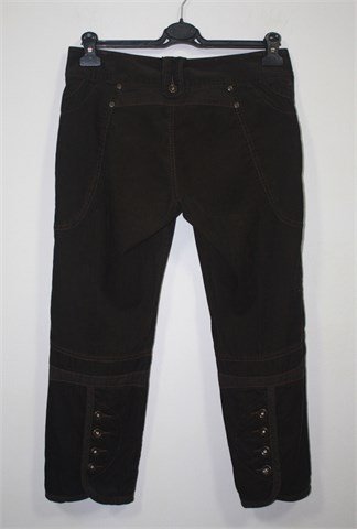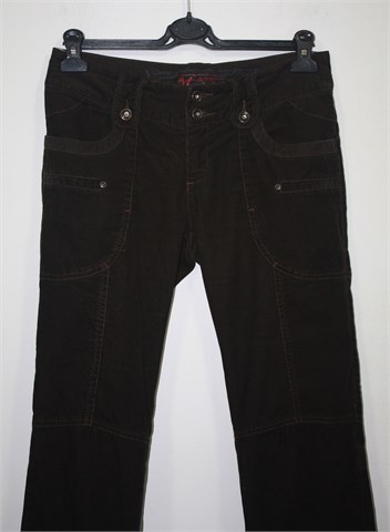 Mexx poluduge hlače od samta, tamno smeđe boje. Prednji cif i kopčanje, pasica za remen. Prednji dublji bočni džepovi. Prošivi na nogavicama sa prednje i stražnje strane, pri dnu nogavica (sa stražnje strane) kopčanje sa četiri gumba.