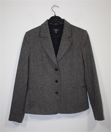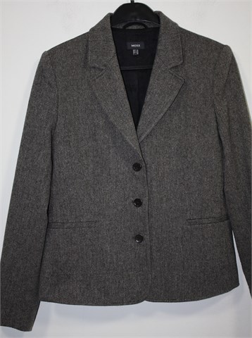 Mexx sako/kraći kaput prošarano crno-bijele boje (djeluje sivo). Prednje kopčanje, mali ukrasni prednji džepovi. Jastučići u ramenima, podstavljena (sitno oštećenje na podstavi).