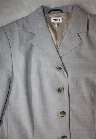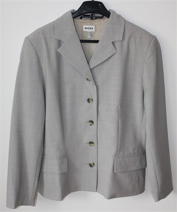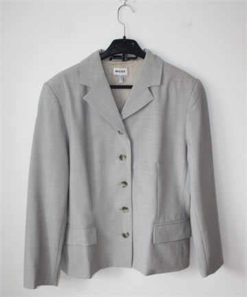 Mexx sako prošarano svijetlo sive boje, klasičnog kroja (vintage model). Prednje kopčanje sa ukrasnim gumbima, bočni džepovi sa preklopom. Jastučići u ramenima, podstavljen (par sitnih oštećenja na podstavi). Blago rastezljiv, po dva ukrasna gumbića na kraju svakog rukava.