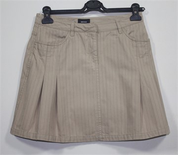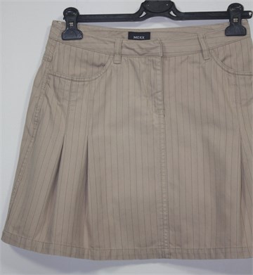 Mexx suknja bež boje sa tamnijim isprekidanim prugama. Prednji cif i kopčanje, pasica za remen. Prednji džepovi, ukrasni ušitci. Čvrst pamuk.