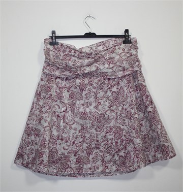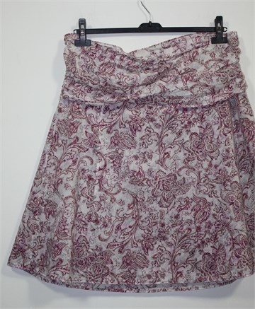 Mexx pamučna suknja bijele boje sa printom (većinom u bordo-tamnije ciklama boji, crnoj i rozoj). Bočni cif i kopčica, podstavljena pamučnom podstavom tamnije boje ciklame. Ukrasni detalji na pasici (sa obje strane) od dodanih traka od istog materijala (ušivene su bočno). Lagana i prozračna.