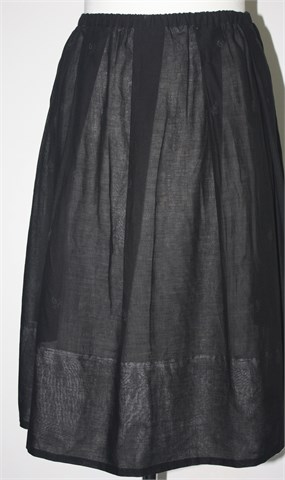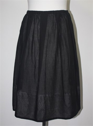 Michel Klein prekrasna suknja crne boje sa sitnim, jedva primjetnim uzorkom na tkanini. Donji unutarnji rub suknje je podstavljen sa bijelom tkaninom i podstava je bijele boje pa je sa vanjske strane blago vidljiva jer je vanjski sloj vrlo tanak i blago providan. U struku je gumica pa je širina prilagodljiva. Lagana i prozračna.