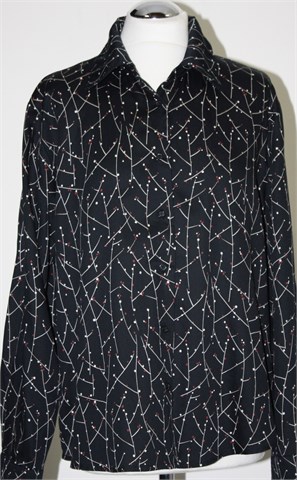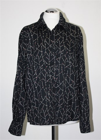 Mikado košulja crne boje sa uzorkom na tkanini (bijele i crvene boje). Prednje kopčanje, stražnji ušitci (blago strukirana). Mekan i glatki pamuk, nerastezljiv.