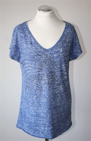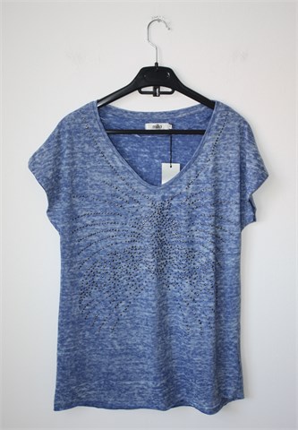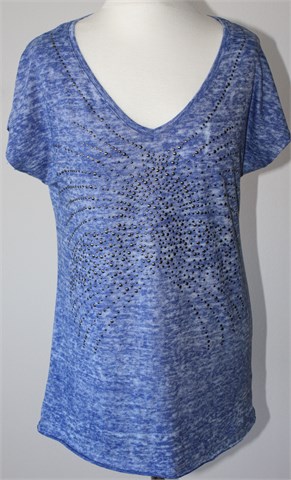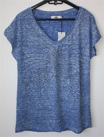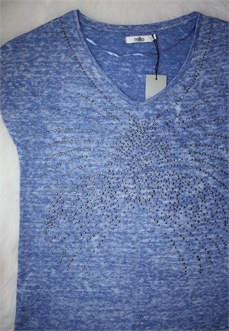Milla majica sa kratkim rukavima prošarano plavo-bijele boje, sa prednje strane aplikacije (vidljivo na slikama). Mekana, tanja i rastezljiva.