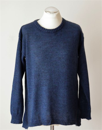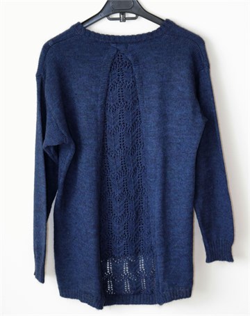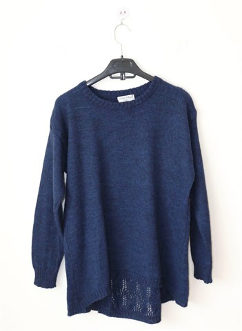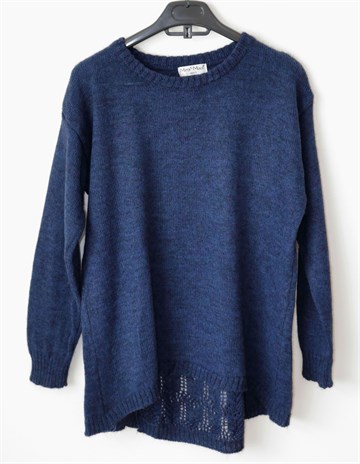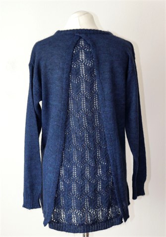 Mimi-Mua vesta/pulover sa dugim rukavima, prošarano plave boje. Sa stražnje strane dio pletiva je rupičast i ima uzorak (vidljivo na slikama). Srednje debljine, mucasto i rastezljivo pletivo. Duža sa stražnje strane (vidjeti mjere).