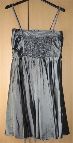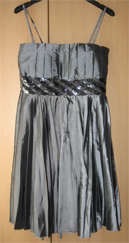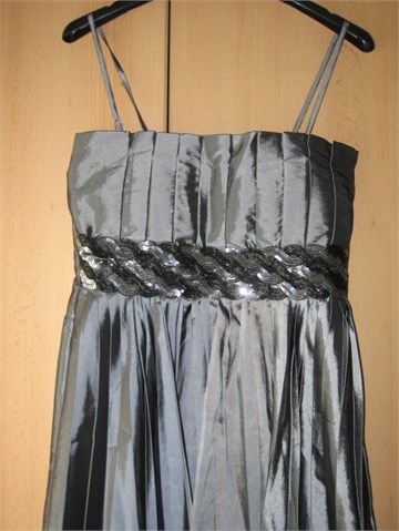 Prekrasna haljinica dužine do cca koljena. Rezana ispod grudi trakom na koju su našivene šljokice u crnoj i srebrnoj boji. Falde na gornjem i donjem dijelu haljine.