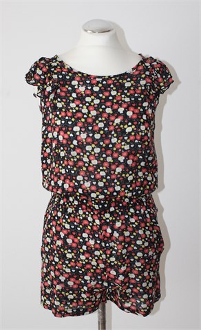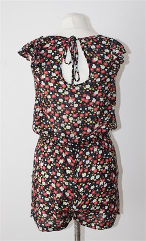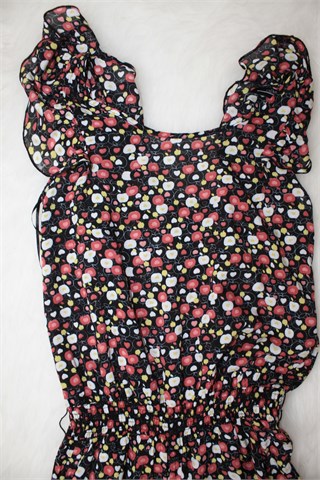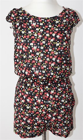 Miso kombinezon crne boje sa šarenim printom jabuka (rozo, bijelo, žute boje - vidljivo na slikama). Kratki rukavići, kratke nogavice. Prednji bočni džepovi, u struku prošiven gumicama. Bočne ušice za remen, vezanje na vratu. Tanak i lagan materijal.