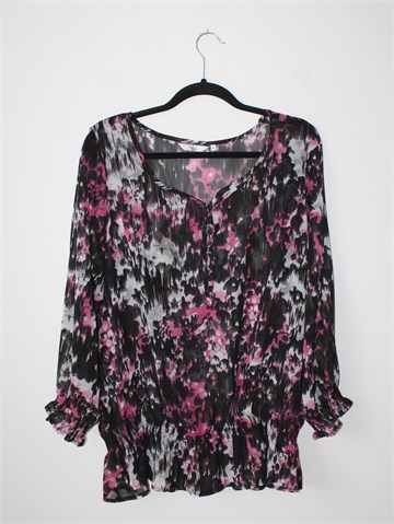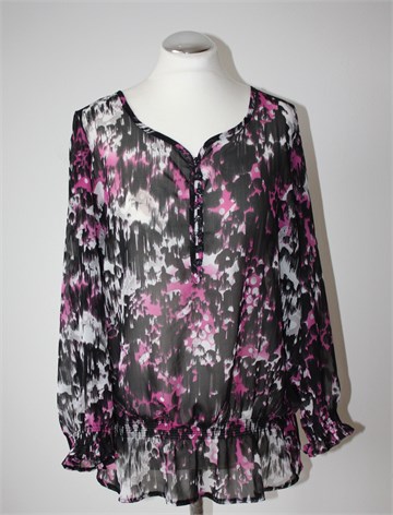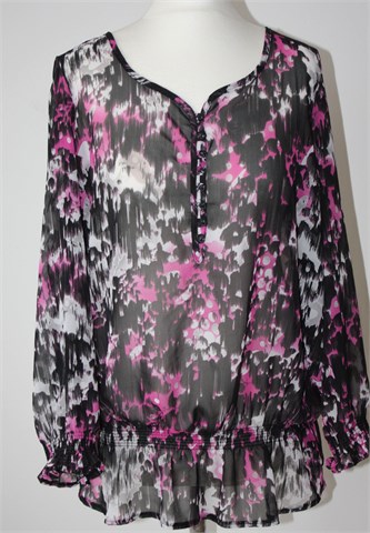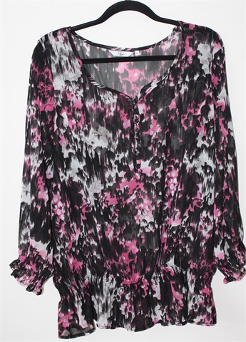Miss Etam bluza/tunika sa poludugim rukavima, crne boje sa šarenim printom (boje i uzorak printa vidljivi na slikama). Prednje kopčanje sa gumbićima, krajevi rukava i pasica prošiveni sa gumicama. Tanka i lagana, providna.