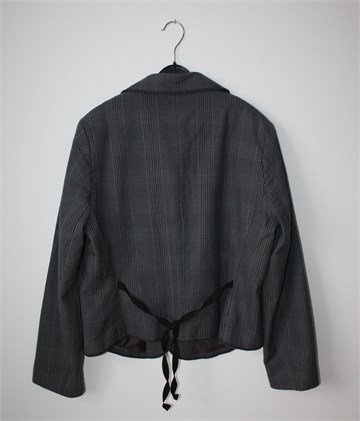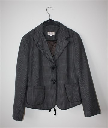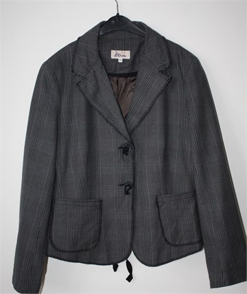 Miss Etam jakna/sako sive boje sa uzorkom (crno-zelenim, vidljivo na slikama). Prednje kopčanje sa dva gumba, bočni džepovi. Jastučići u ramenima, blago strukirana. Nije rastezljiva.