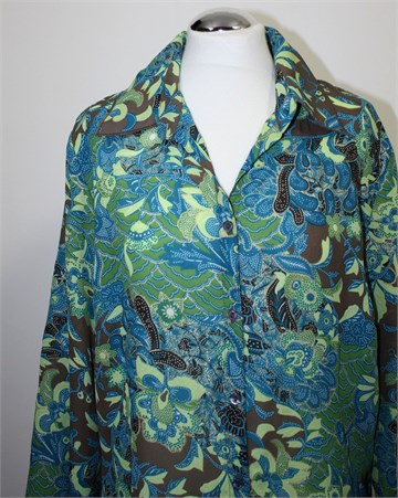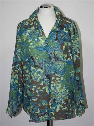 Miss Etam košulja sa poludugim rukavima, prošarani uzorak u većinom plavim i zelenim nijansama, mjestimično ukrašena zlaćanim aplikacijama. Prednje kopčanje, prednji i stražnji ušitci (strukirana). Vrlo lagana i prozračna, blago prozirna.