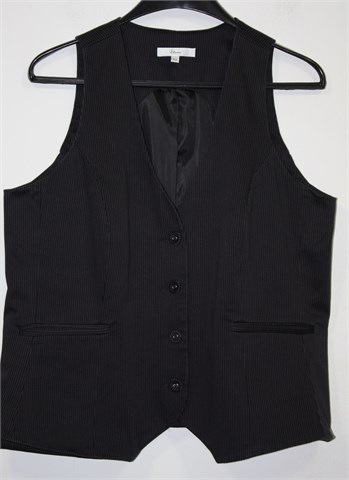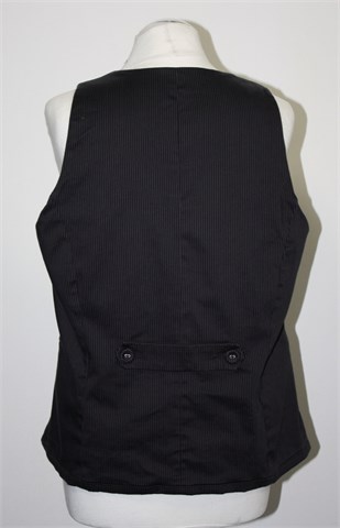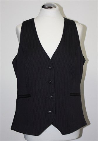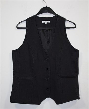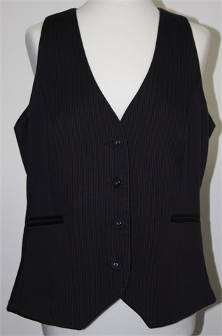 Miss Etam prsluk crne boje sa tamno sivim prugama. Prednje kopčanje, bočni džepići (zašiveni). Strukiran i blago rastezljiv.