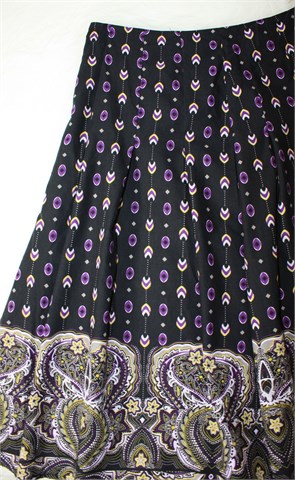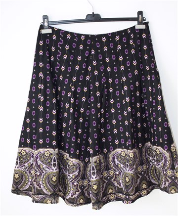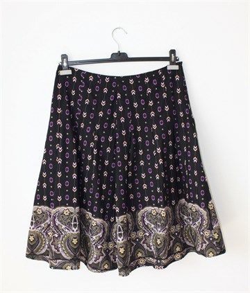 Miss Etam suknja crne boje sa šarenim printom (boje i uzorak printa vidljivi na slikama). Bočni cif, podstavljena.