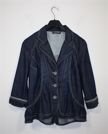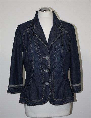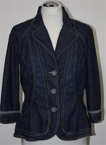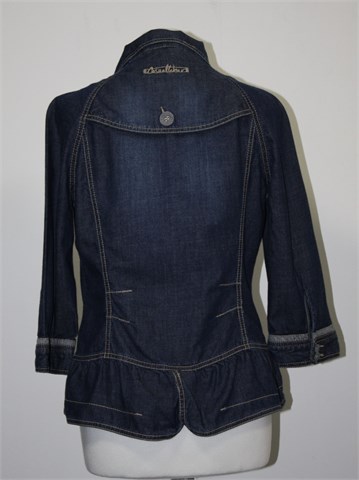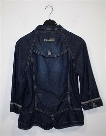 Miss Etam traper jakna sa poludugim rukavima, tamnije plave boje. Prednje kopčanje, ukrasni prošivi sa prednje i stražnje strane. Tanji i mekan traper.