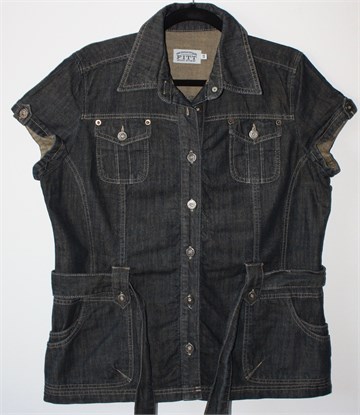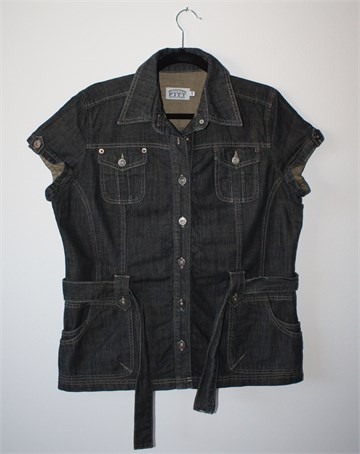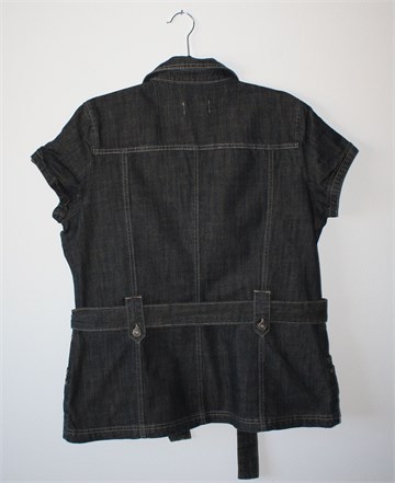 Miss Etam traper jakna sa kratkim rukavima, tamnije plave boje. Prednje kopčanje, prednji bočni i džepići na prsima. U struku pripadajući remen (može se skinuti), nije rastezljiva.