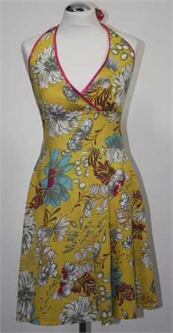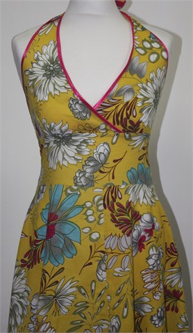 Miss right šarena kraća haljina/tunika, tamnije žute boje sa cvjetnim printom. Vezanje oko vrata, rastezljive gumice na leđima, bočni cif. Lagana i lepršava.
