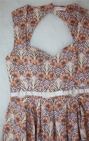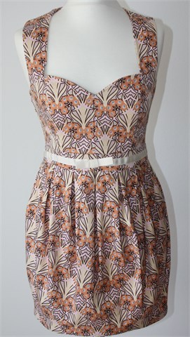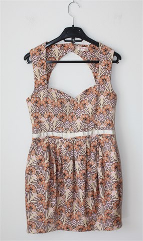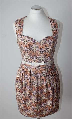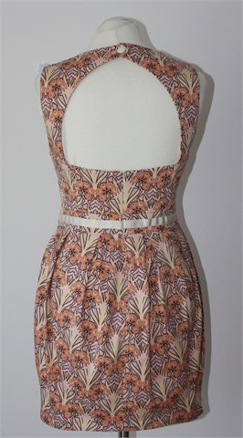 Miss Selfridge haljina nude boje sa cvjetnim printom (boje i uzorak printa vidjljivi na slikama). Stražnji cif i kopčica, podstavljena u gornjem dijelu. U struku ukrasna trakica sa mašnicom, ispod trakice/pasice falde (pufasti donji dio). Blago rastezljiva.