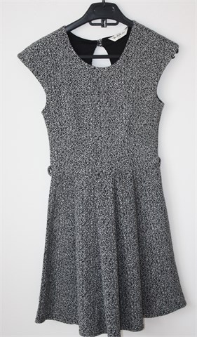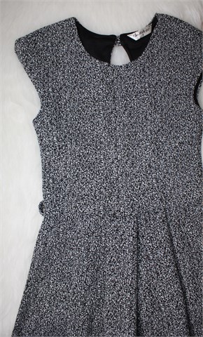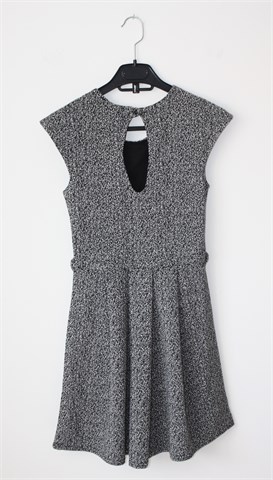 Miss Selfridge haljina sa kratkim rukavima, prošarano crno-bijele boje (vidljivo na slikama). Rezana u struku, faldice u donjem dijelu. Materijal srednje debljine (za prijelazno vrijeme), podstavljena u gornjem dijelu. Rastezljiva.