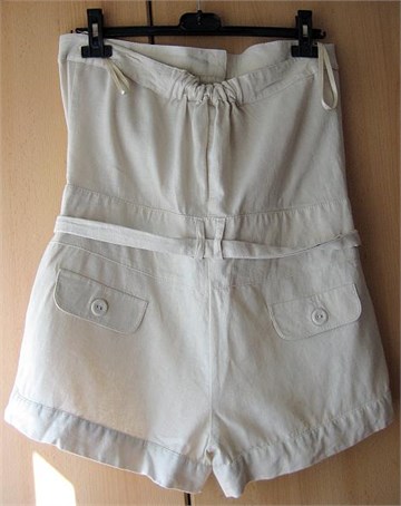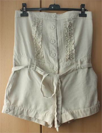 Jumpsuit ili hlačice+top u jednom odjevnom predmetu. Top bez naramenica, ukrašen gumbima, volančićima i prošivima sa prednje strane, sa stražnje strane gumica za udobnije nošenje. Spojene kratke hlačice sa cifom (otraga lažni džepovi na preklop). Vizualno odvojeno remenom  u stuku.