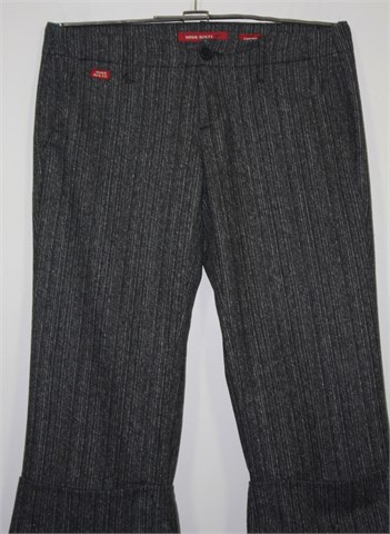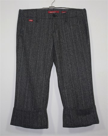 Miss Sixty poluduge hlače prošarano-prugasto crno-bijele boje (djeluju sivo), materijal je kao tanji štof. Prednji cif i kopčanje, pasica za remen. Prednji bočni džepovi.