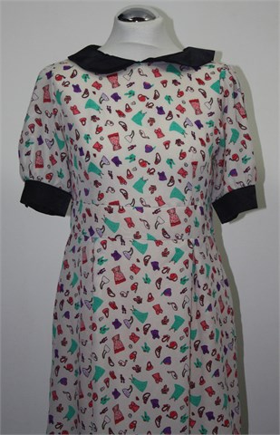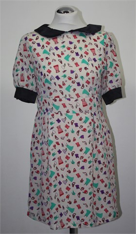 Missta haljina sa kratkim rukavima, nude/bež boje sa printom (torbica, haljina, cipela...) i sitnim svijetlim točkicama. Kragnica i rubovi rukava su crne boje (svilenkasti materijal koji djeluje kao saten), bočni cif. Rezana u struku, prema dolje se blago faldasto širi. Donji dio haljine je podstavljen, gornji dio nije pa je providna. Tanji i lagan materijal.