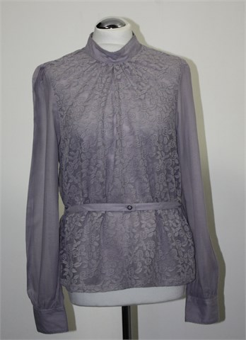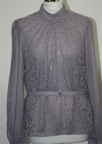 Modea bluza sive boje (blago boja vuće na neku nijansu sivo-ljubičaste), dio u tijelu materijal sa čipkom a rukavi i podstava su bez uzorka. Visoka kragnica sa kopčanjem sa stražnje strane (2 gumbića), kopčanje i na krajevima rukava (po 3 gumbića). Bočne ušice za remen sa pripadajućim remenčićem koji se može i ne mora nositi. Cijela je blago providna iako je podstavljena.