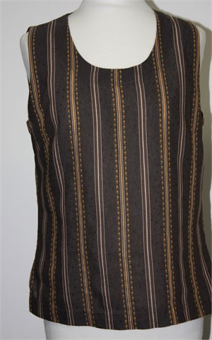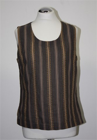 Modea bluza bez rukava, smeđe boje sa prugama i uzorkom (boje i uzorci kao na slici). Bočni cif, mali bočni rasporci. Lagan i prozračan materijal.