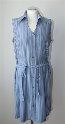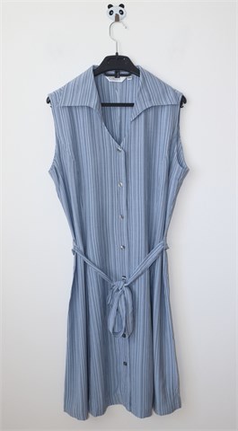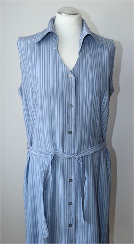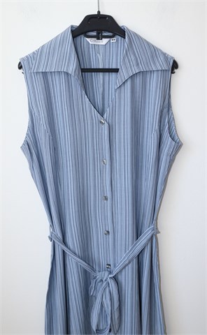 Modea haljina bez rukava, plave boje sa tamnijim prugama. Sa prednje strane kopčanje cijelom dužinom, bočne ušice za remen sa pripadajućim remenom. Prednji i stražnji ušitci (blago strukirana). Lagana i blago rastezljiva.