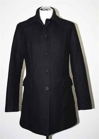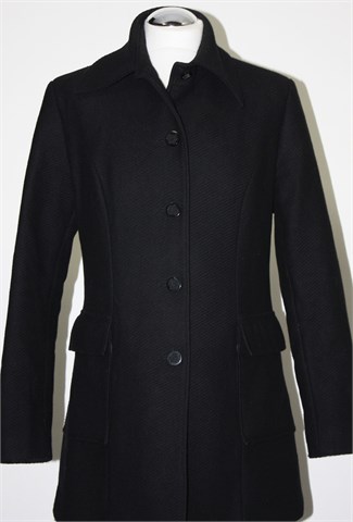 Modea kaput crne boje sa diskretnim prugama na tkanini, srednje dužine. Prednje kopčanje, bočni džepovi sa preklopom. Jastučići u ramenima (ušiveni), strukiran. Podstavljen. Šav ispod kragnice (sa prednje strane) se malo odšio ali ne vidi se od kragne (i može se lako zašiti).