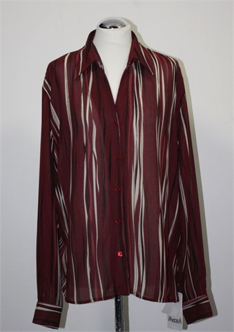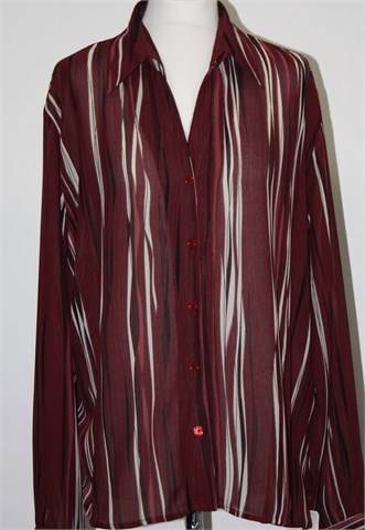 Modea košulja sa dugim rukavima, tamno crveno-bordo boje sa prugastim uzorkom (vidljivo na slikama). Prednje kopčanje, blago strukirana. Lagana i providna.