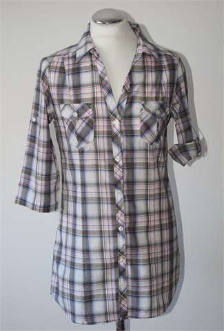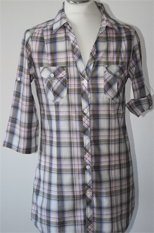 Modina košulja/tunika sa poludugim rukavima (mogu se nositi i kao kraći - gumbić sa vanjske strane rukava i vezica unutar rukava), bijele boje sa šarenim prugasto-kariranim uzorkom (boje uzorka kao na slikama). Prednje kopčanje, džepići na prsima. Nije rastezljiva.