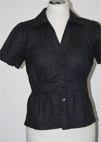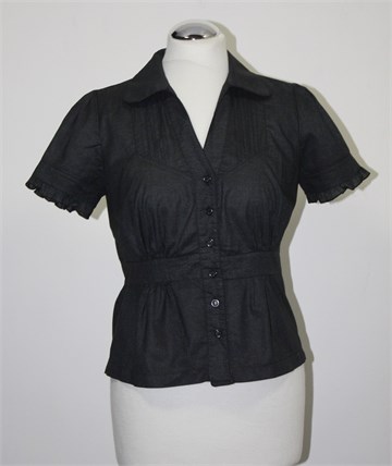 Modocornelia košulja sa kratkim rukavima, tamno sive boje sa sjajem (na materijalu su kao sitne sjajne točkice pa košulja ima decentan sjaj). Prednje kopčanje, ukrasni ušitci, volančić na kraju svakog rukava. Lagan materijal.