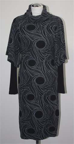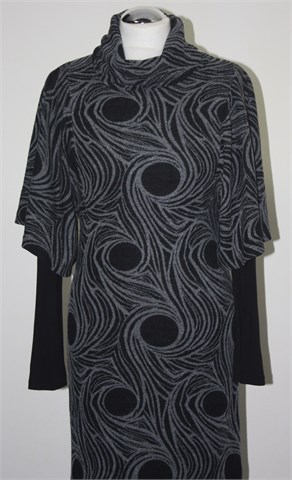 Monica Belluci haljina/tunika sa dugim rukavima i dolčevita ovratnikom, prošarano crno sive boje (uzorak na tkanini). Mekana i rastezljiva, materijal je tanji i mucav sa vanjske strane. Širi vanjski rukavići, našiveni rukavi crne boje (kao majica ispod).