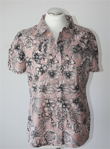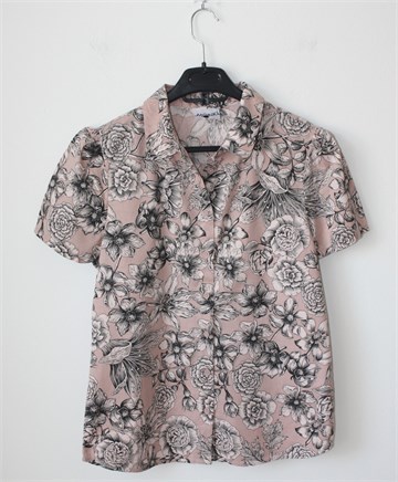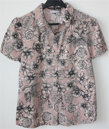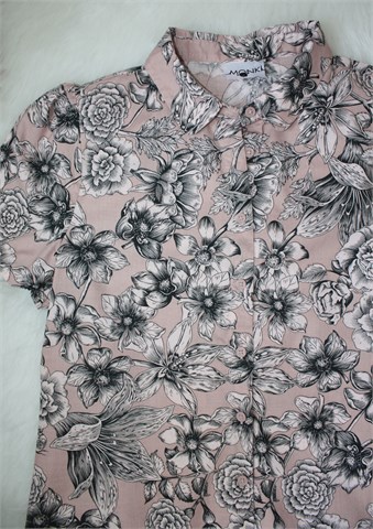 Monki košulja sa kratkim rukavima, prljavo roze boje sa crnim cvjetnim printom (uzorak printa vidljiv na slikama). Prednje kopčanje, blago pufasti rukavići. Čvrst i nerastezljiv pamuk (kao platno).