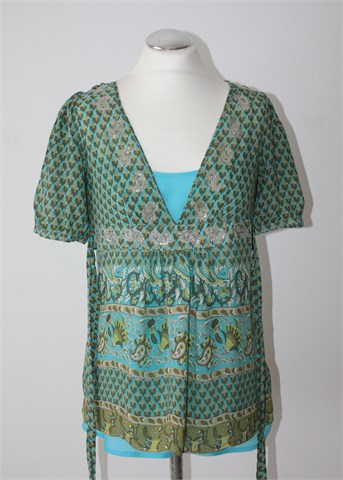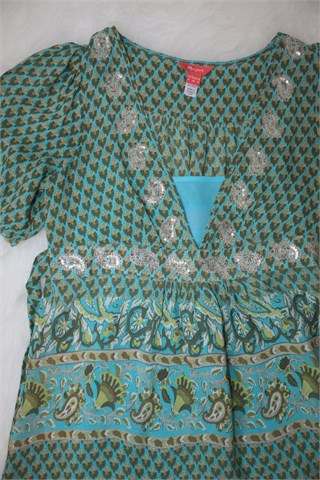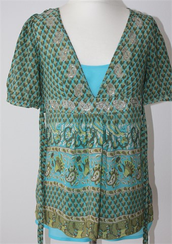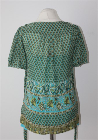 Monsoon bluza sa kratkim rukavima, plavo-zelene boje sa šarenim printom (vidljivo na slikama). Sa prednje strane našivene aplikacije od srebrnog konca i srebrnih šljokica. Bočne trake za vezanje. Unutarnji topić tirkizne boje  mali duži od bluze (može se odvojiti od bluze sa malim drukerima).