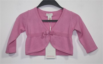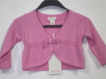Monsoon (Accessorize) vestica/kardigan roze boje. Dugi rukavi, prednje kopčanje na jedan gumbić (skriven je sa mašnicom). Mekano i rastezljivo pletivo.