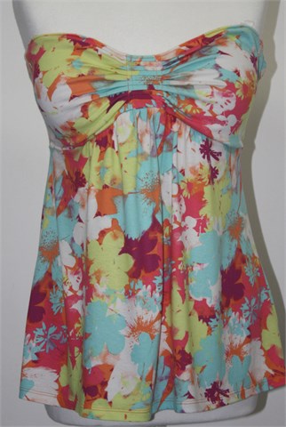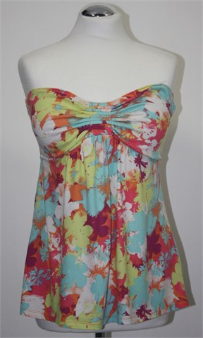 Mossimo topić bez naramenica sa šarenim cvjetnim printom. U prsima podstavljen sa spužvastim jastučićima (ne mora se nositi grudnjak), sa stražnje strane rastezljive gumice pa je širina prilagodljiva. Mekan i vrlo ugodan materijal.