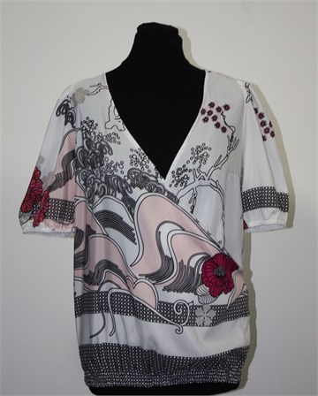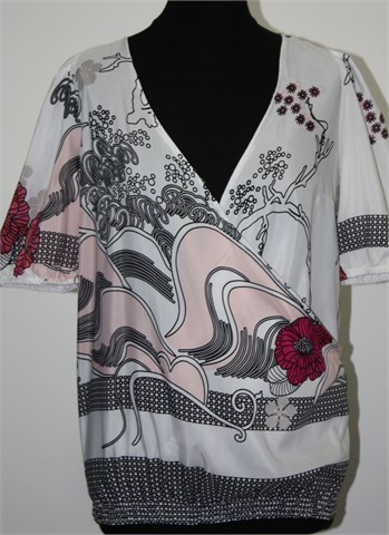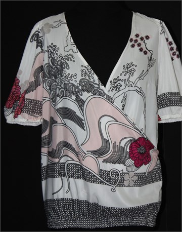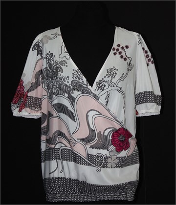 Motivi bluza sa (dužim) kratkim rukavima, bijele boje sa printom/uzorkom (kao na slici). Sa prednje strane fiksni preklop (dosta otvorena, bilo bi dobro nositi topić ispod), u pasici stegnuta gumicama. Gumica na krajevima rukava. Lagana i prozračna, blago providna.