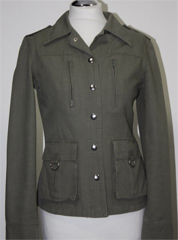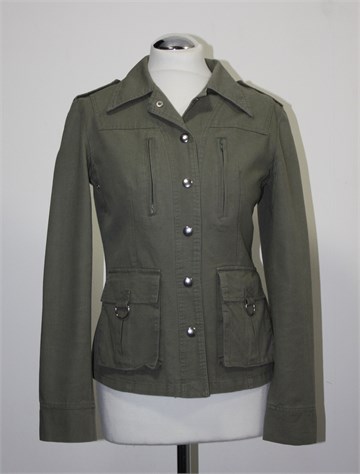 Motivi pamučna jakna svijetlo maslinasto zelene boje. Prednje kopčanje sa drukerima, bočni džepovi sa preklopom (par sitnijih oštećenja oko džepova ali ništa jako vidljivo). Mali prorezi na krajevima rukava, blago strukirana.