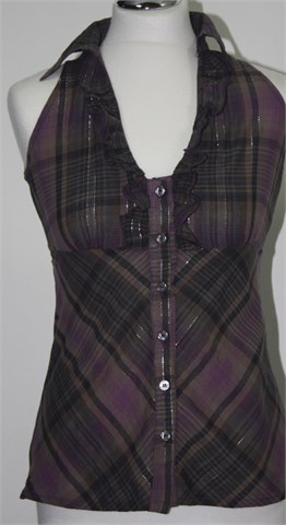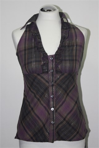 Motivi košulja bez rukava u tonovima ljubičaste i smeđe boje sa prugasto-kariranim uzorkom, mjestimično protkana sjajnim nitima. Prednje kopčanje, ukrasni volančići sa prednje strane. Bočne vezice za vezanje, rezana ispod grudi. Mekan i lagan pamuk.