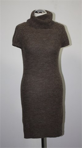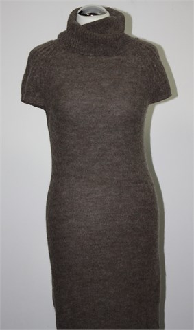 Motivi pletena tunika/kraća haljina sa kratkim rukavima i dolčevita ovratnikom, prošarano smeđe boje. Mekano, mucasto i rastezljivo pletivo.