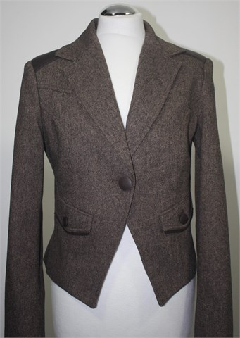 Motivi kraći sako/blazer od tvida, prošarano smeđe boje sa detaljima od umjetne kože u smeđoj boji (na gumbima, ramenima i ukrasnim trakama oko džepova). Prednje kopčanje sa jednim gumbom, dva bočna džepa sa preklopom i gumbom. Prednji i stražnji ušitci, strukirana. Podstavljena, blagi jastučići u ramenima. Mali prorezi na krajevima rukava (mogu se nositi i podfrknuti).