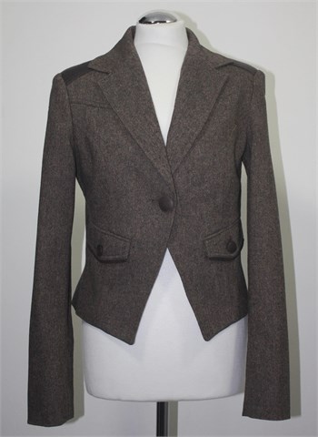 Motivi kraći sako/blazer od tvida, prošarano smeđe boje sa detaljima od umjetne kože u smeđoj boji (na gumbima, ramenima i ukrasnim trakama oko džepova). Prednje kopčanje sa jednim gumbom, dva bočna džepa sa preklopom i gumbom. Prednji i stražnji ušitci, strukirana. Podstavljena, blagi jastučići u ramenima. Mali prorezi na krajevima rukava (mogu se nositi i podfrknuti).