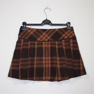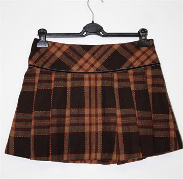 Motivi kraća suknja od debljeg štofastog materijala, smeđe-bež boje prošivena narančastim koncem. Faldice sa prednje i stražnje strane, bočni cif i kopčice. Podstavljena.