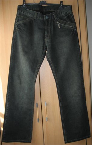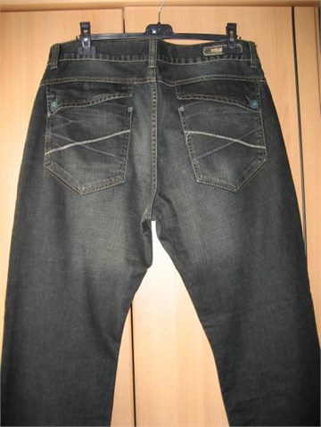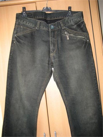 Muške traper hlače, traper tamno sivo/crne boje. Pasica za remen, dva prednja džepa + jedan na cif, dva stražnja džepa. Aplikacije od konca na stražnjim džepovima. Veličina na hlačama piše W38/L36 (vidjeti mjere).