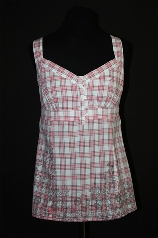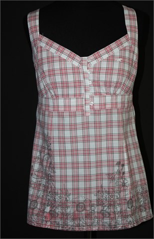 Mustang bluza/topić bijele boje sa prugasto-kariranim uzorkom i cvjetnim printom. Tanke fiksne naramenice (zašivene), blago rastezljive gumice na leđima. Dupli materijal na prsima, lagana i prozračna.