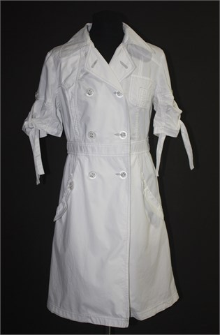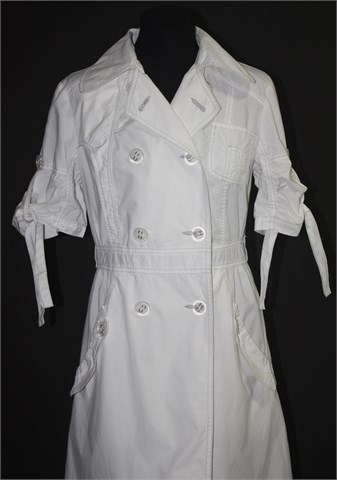Myokie jakna/baloner bijele boje, krojena kao haljina. Sa prednje strane preklop i kopčanje sa gumbima (nije cijelom dužinom - vidjeti sliku), u struku pasica za remen. Bočni džepovi, kratki rukavi sa vezicama pomoću kojih se mogu još dodatno skratiti. Tanak i lagan pamuk, preštapana sivim koncem.
