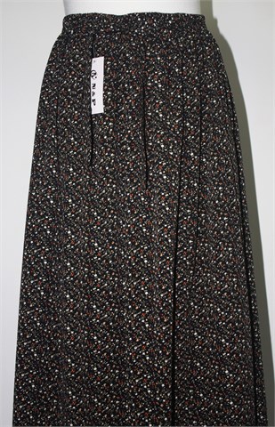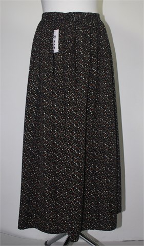 N&P dugačka (maxi) suknja crne boje sa sitnim cvjetnim printom. U struku je gumica (i ukrasno vezanje) pa je širina dosta prilagodljiva. Tanji i lagan materijal.