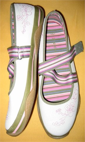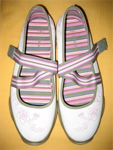 Balerinke. Bijele boje, našivene cvjetne aplikacije sa rozim koncem na bočnim stranama i prednjoj strani. Detalji u maslinasto zelenoj i rozoj boji.