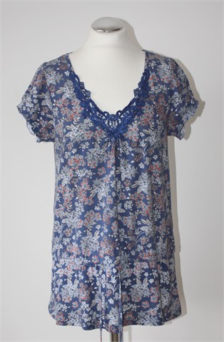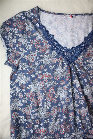 NKD Outfit majica/tunika sa kratkim rukavima, plave boje sa cvjetnim printom (boje i uzorak printa vidljivi na slikama). Oko dekoltea (sa prednje strane) našiveni su ukrasni heklani detalji. Cca u struku gumica sa vezicama. Mekana, tanja i rastezljiva.
